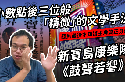 這週我想來聊聊新寶島康樂隊的〈鼓聲若響〉。其實這首歌我遲疑好久了,總是覺得有點難講,所以先上其他題材。它的角色、故事非常簡單,基本上就是一個人獨白到底。然而,在這麼簡單的框架裡,卻能寫出非常「精微」的心情,這是很難的。因此,今天我們就藉這首歌,來聊聊文學裡面的「精微」是怎麼一回事。